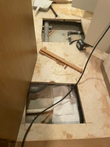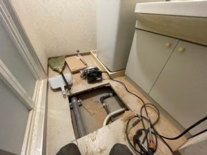 洗面所の床も切り取って、配管を確認します。
