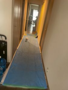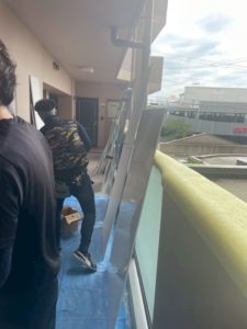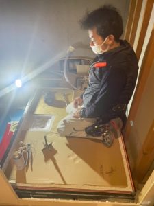 廊下で忙しく作業されている職人さんたち。