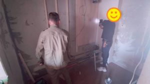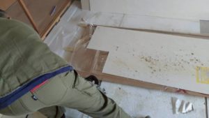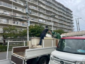キッチンの部材が運び出されるのを確認し、