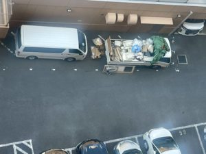 眼下には弊社のトラックとハイエースが